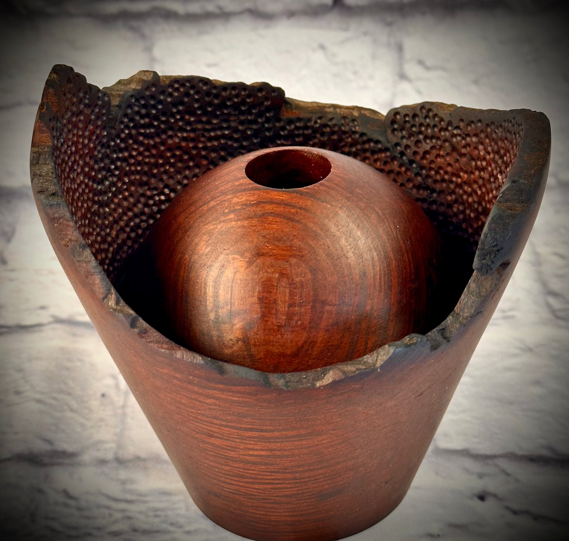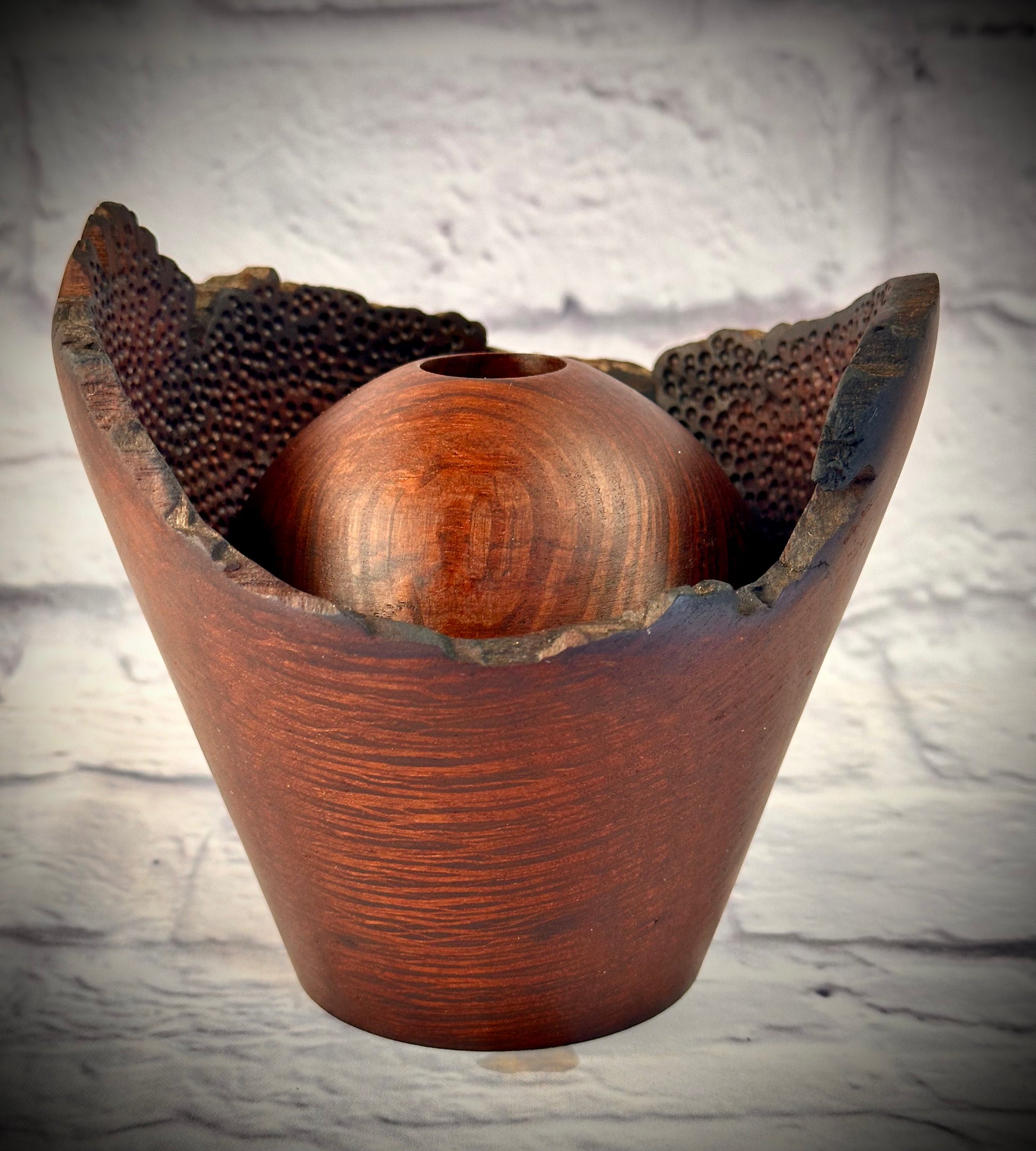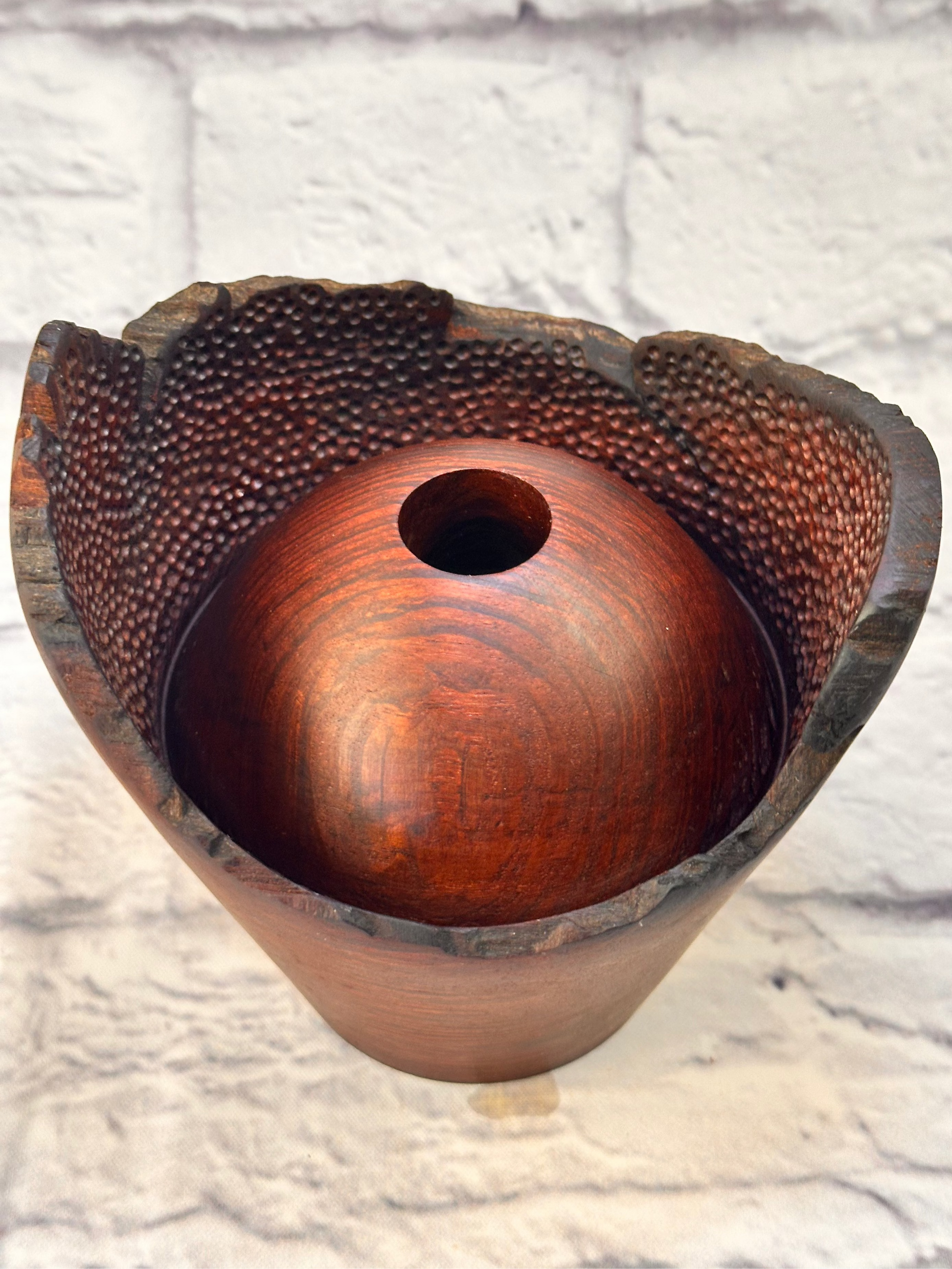 This decorative piece is more than just a hollow form—it's a work of art, seamlessly combining organic elements with expert craftsmanship. Finished with natural oils and waxes, it exudes a soft sheen that enhances its visual and tactile appeal.